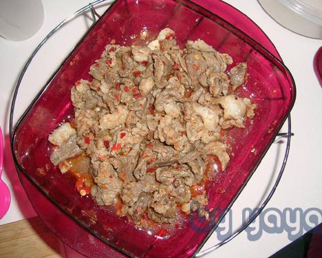 羊肉切薄片,放入特百惠欢宴四合一(小)内,与盐、姜粉、花椒粉、孜然粉、辣椒粉搅拌均匀,腌置三分钟。