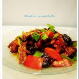 5、煮到快收汁的时候放入青红椒、加盐、鸡精翻炒,