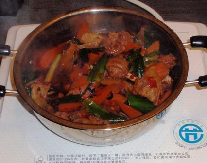 2个小胡萝卜,1个圆白萝卜,3根大蒜(上海叫蒜苗),羊腿肉6两,酱油,盐,干辣椒,葱,姜