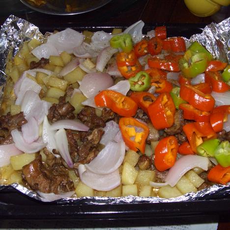 烤箱上下火200度预热3分钟,烤盘铺锡纸,羊肉均匀铺在烤盘上,200度烤5分钟,加土豆烤20-25分钟,(中间可以尝一下土豆的成熟度以决定烤制时间),土豆9分熟加洋葱再烤5分钟,加青红辣椒烤3分钟.出炉撒孜然粉黑胡椒粉.