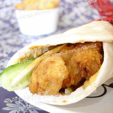 2、肯德基中的墨西哥鸡肉卷,和老北京鸡肉卷的做法一样,不过就是将黄瓜、大葱和甜面酱换成了生菜、西红柿、洋葱和沙拉酱。