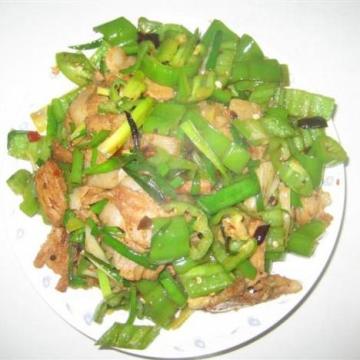 主料:猪腿肉,蒜苗,青辣椒,红辣椒