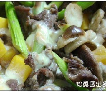 材料:芦笋4两,杂菇2两,南瓜1两,牛肉2两,芝士1片,调料:盐,黑胡椒,橄榄油,淀粉