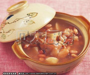 将泡好的花生仁、猪手块、老姜片放入砂煲中,再加入1800ml温水,大火煮开后转小火炖1个小时。