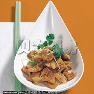 2.热锅倒入适量油烧热,放入青葱段小火爆香,加入后腿肉片及所有调味料a拌炒至肉片完全熟透,最后加入调匀的太白粉水勾芡,淋上香油即可。