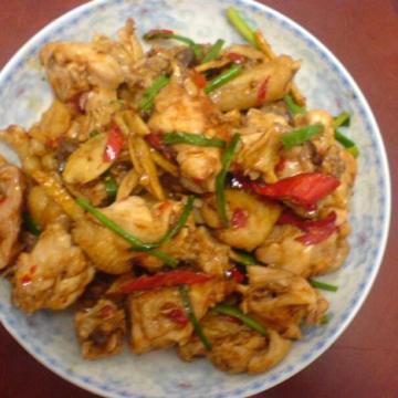 7、鸡肉熟了,收汁以后,加入辅料,辣椒、元葱翻炒一下即可。
