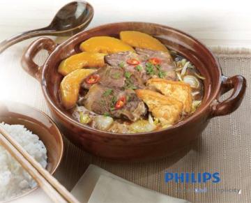 4、按下「焖/炖」键后选择「焖」程序。烹调时间设定为2小时30分钟。然后按「烹调」开始煮。煮完拌入辣椒和葱即可。提示:如果没时间,可以省去步骤1和2。