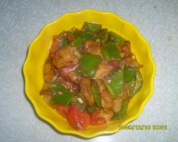 (3)勺内放底油,烧热,放入肉片煸炒,再放葱丁、姜末、蒜片、茄块、青椒块、醋、料酒烹,再加汤、酱油、盐、味精、糖烧开,用中小火收汁,汁农时,用湿淀粉勾芡,淋香油装盘即好。
