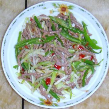 4、另起油锅,下青椒丝、韭黄爆炒至熟,牛肉入锅,加少许鸡精起锅翻炒出锅。