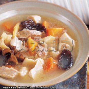 3.3、二小时后放入切好的胡萝卜与香菇一起煲半小时即可出锅了,出锅时在碗内放盐,点缀上香菜即可食用