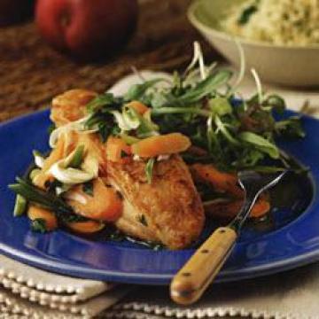 3.锅内放入青葱、胡荽籽和60毫升橙酱汁,并刮起锅底的油脂和肉屑,煮30秒。倒入剩余的橙酱汁、胡萝卜和鸡肉。沸后盖上锅盖,转小火煮20分钟,至鸡肉煮熟,胡萝卜熟软为止。