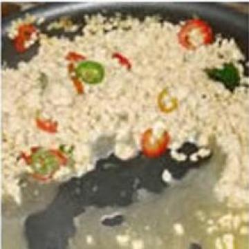 1.取一个大炒锅在大火上预热,待锅快要冒烟时,倒入花生油,立即下大蒜翻炒。炒至大蒜开始变金黄色,约20秒。加入绞鸡肉,继续翻炒,炒至肉散开及不再是粉红色,约2分钟。
