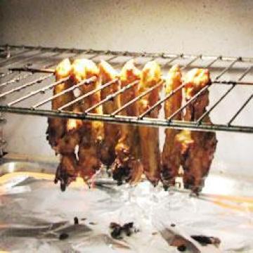 烤箱预热到200度,取上火,使鸡肉部分悬空烘烤(约7分钟),过程中要翻面一次。也可使用炭火烧烤炉来烤,须不断翻面使肉串均匀受热。