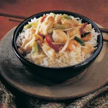 长粳米300克,花生油42/3汤匙,盐少许,小干红辣椒8—10根,大蒜1瓣,太白粉(生粉)2汤匙,大鸡蛋1个(用蛋清),去骨火鸡脯500克,蜂蜜2汤匙,酱油6汤匙,日本清酒或无甜味雪利酒2汤匙,罐装荸荠(马蹄)225克,大葱8根,新鲜豆芽200克,咸味烤腰果85克,米醋或白葡萄酒醋2茶匙