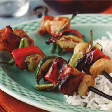 3.肉串离热源约10厘米,烤12至14分钟,不时转动并涂抹照烧酱,直至蔬菜脆嫩,鸡肉熟透,即可食用。