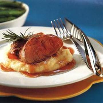 黄油1汤匙,橄榄油2汤匙,小牛臀部肉1块,约800克,切成4片,迷迭香2枝,黑胡椒适量,略甜的雪利酒240毫升,红醋栗(红加仑子)果冻11/2汤匙,无盐黄油1汤匙