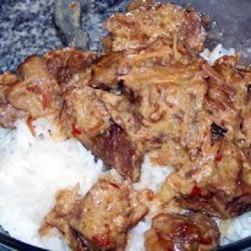 5.加入糖、椰丝、丁香、肉桂根、椰奶和水。煮沸后转为低火,再蒸煮到汁液蒸发完,牛肉变嫩为止,大约1小时。然后加适量盐即可。
