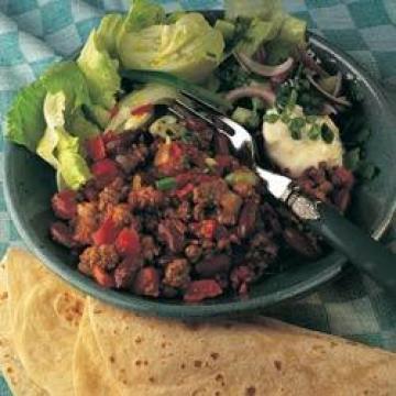 小红甜椒1个,新鲜小红辣椒1根,中等大小洋葱1颗,葵花籽油2汤匙,瘦牛肉末500克,干红辣椒1汤匙,小茴香末1汤匙,大蒜3瓣,罐装番茄块400克,番茄茸2茶匙,干牛至1茶匙,红酒或牛肉高汤125毫升,盐少许,糖1/2茶匙,大葱2根,罐装菜豆400克,墨西哥玉米薄饼8片,酸奶油4汤匙