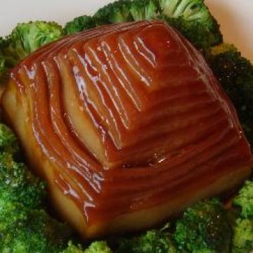 7.将姜,葱,猪骨头捞出弃掉。用大火收汁,待汤汁变浓后浇在猪肉上。把焯好的西兰花摆放在肉块周围即可。