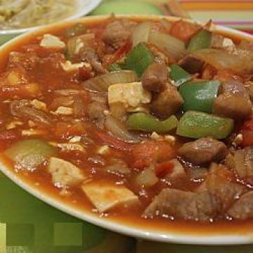 2.快火下油(约1汤匙)起锅,爆香蒜头,红葱头再加入洋葱和1茶匙盐炒软身,再加入青椒,蕃茄和汁料炒匀煮开,加入肉粒和豆腐炒匀,盖盖焗3分钟,装盘即成。