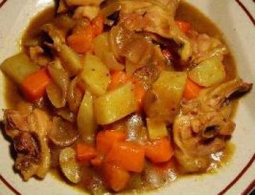 排骨,土豆,青椒,红椒,味好美油咖哩,葱,蒜,酒,盐