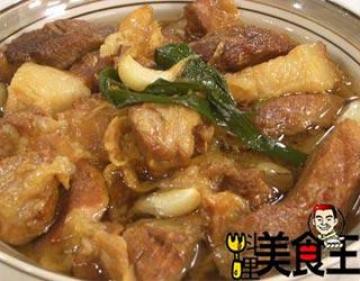 4.取一砂锅,先放入作法3的材料,再放入作法1的肉块、与调味料b一起煮滚,再加入适量的水(注意水量需盖过肉)续煮滚,之后盖上锅盖,转小火卤约1.5小时。