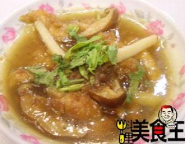 2. a料入开水汆烫,炒香香菇丝及虾米碎后,加入d料与a料煮滚,用太白粉水芶芡,即成羹芡汁,再将肉羹放入。食用时,加入b料调味即可。