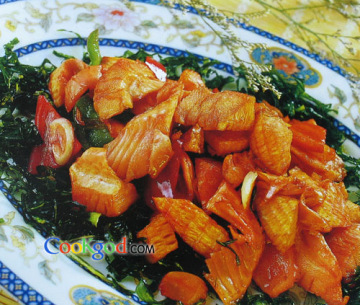 三、将笋和雪里蕻再放入高热猪油锅内炸约二分钟,使笋变成金黄色,雪里蕻脆而酥,再将油滤去,撒上少许味精,颠翻三秒钟即好,色黄黑分明,冬笋香嫩,雪里蕻脆酥,适宜于冬季。