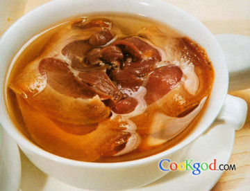 (2)上汤1000g烧开,灌入炖器中。加盖,蒸纸包严上笼蒸3小时,取出。用味精1g,鸡粉1g,精盐少许调味,再蒸15分钟即可。