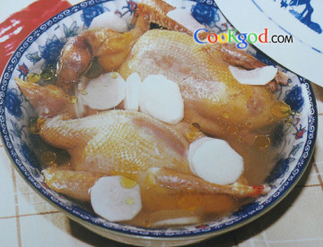 3、鸽子放入蒸锅内,放入葱结,姜片,加盖蒸约两小时取出,去掉葱、姜、淋鸡油即成。