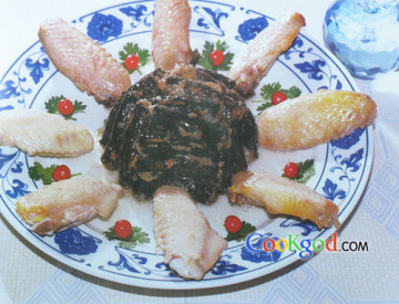 5、将鳝鱼段码入碗内压实,翻扣在盘中间,取出凤翅呈放射状摆在鳝鱼段四周,去掉排骨。汤汁内加味精,浇在盘内即成。