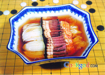 1、将白菜芯洗净,放入沸水中大火汆1分钟,取出控水;酱肉片成长10厘米、宽4厘米、厚0.5厘米的片。