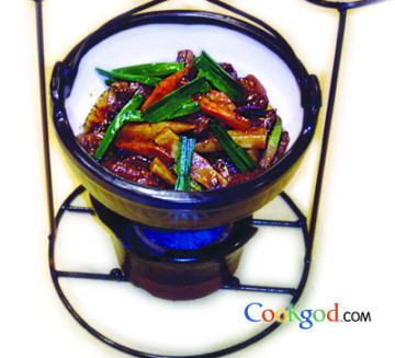 3、吊锅内放入15克色拉油,烧至七成热时下入青蒜大火煸炒出香,加入胡萝卜条、年糕、烧好的羊肉和烧羊肉的汤汁大火烧5分钟后,下入味精调味即可。