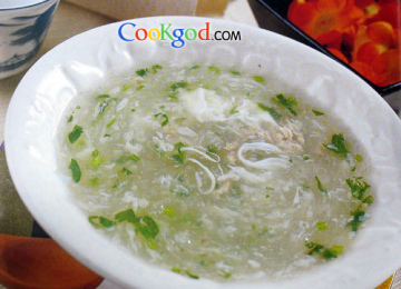 3.将作法2的材料以中火煮滚后以太白粉水加以芶芡,起锅前淋入蛋白呈雪花片状,最后洒上葱花即可。