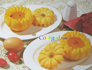 2、小南瓜刻花刀切开,去籽去肉,做成盅状。