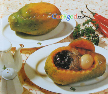木瓜5个,鱼肚10克,海参15克,鸽蛋1个,花菇1朵,蹄筋10克,鱼翅5克,本鸡、老鸭各20克调料鲍汁50克,绍酒5克,葱、姜各5克,糖3克,海鲜素2克