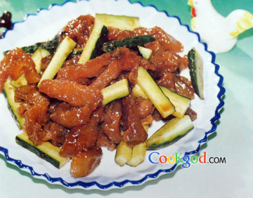 4、下入瓜条翻匀,出锅盛入盘内即成。