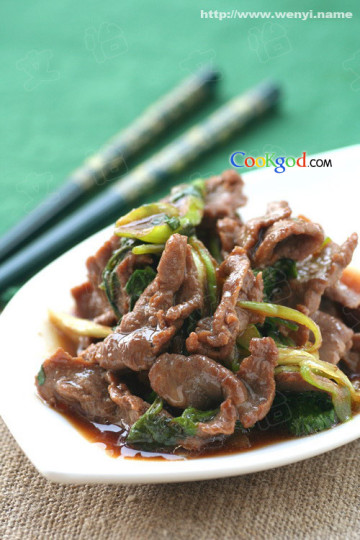 2)平底锅烧热倒入油,待8成热时倒入牛肉片,不停的快速翻炒至牛肉变色后,淋入一点米醋。放入葱丝和香菜段,稍微翻炒几下即可。
