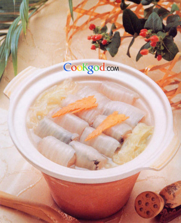 3、加力鱼肉块用淀粉上浆,下油锅过油捞出,拌上姜丝,分别用白菜茎片含卷成形,用过油焯水后的白菜嫩叶作底,装入砂锅,下鱼汤、青蒜片、精盐、味精,用明火火工熟,调以胡椒粉即成。