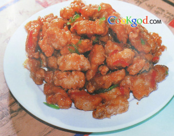 猪五花肉300克,鸡蛋1个,面粉、湿淀粉各40克,白糖125克,青、红丝各10克,糖桂花5克,油800克。