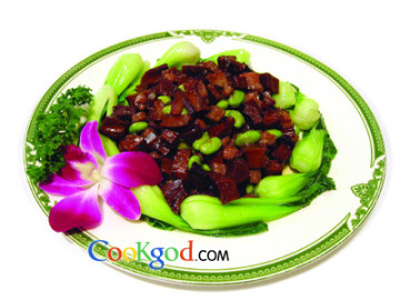 3、另起油锅,用中火把油温烧至四成热,下入浆牛肉丁滑油30秒,留少许油加入烧好的腊笋丁和汆好的毛豆肉,用旺火烧开再用小火烧10分钟,收汁倒入滑过油的牛肉丁,淋上香油,装入焯过水的菜芯中即可。