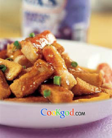 2.蟹肉捞出后,以余油炸豆腐条,炸黄即捞出;