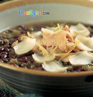 百合50克,红豆、绿豆各25克,猪瘦肉250克,盐、黄酒各适量。