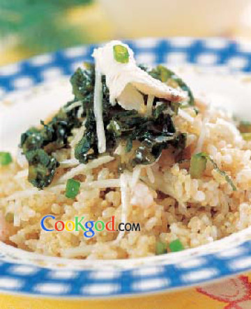 3.烧热油锅,爆香香葱花、生姜末,再放入雪里蕻、笋丝以大火炒香,加入其余所有调味料后转小火,煮至即将收汁时,将虾仁、鲩鱼片、白米饭下锅拌炒均匀即可。