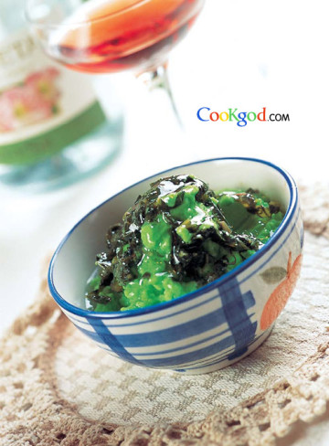 4.往蚕豆泥中加少许高汤,拌匀,放入雪菜,调入白糖,改大火煮沸,略收汁即可。