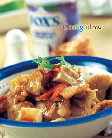 1.豆腐切块;胡萝卜切片;姜切末备用;猴头菇洗净,用冷水泡软,以手撕成块状后,挤干水分,加入蛋、咖喱粉、油、精盐、白糖抓拌均匀后,先放入玉米粉拌匀,再沾裹一层地瓜粉;