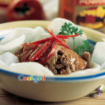 3.锅内留底油,烧热后倒入洋葱、姜、蒜、咖喱粉、沙茶酱、料酒、白糖、盐、高汤、味精、牛肉片,用水淀粉勾薄芡,待汁稠时盛出倒入装有虾片的盘中即可。