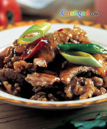 牛肉酥烂,桃仁脆嫩。可先把桃仁炸透,等牛肉快出锅时再加入,这样烹制出的桃仁更酥脆,口感更佳。