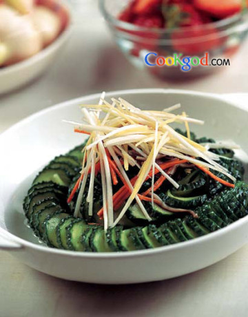 3.将切好的黄瓜用盐腌出水后,冲洗干净摆入盘中,最后浇上汁。