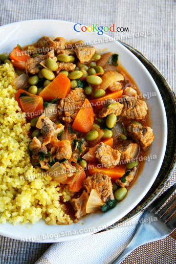 用家里的牛肉代替了这道菜中的羊肉,冰箱里正好还有胡萝卜,用青豆代替了这道菜中的橄榄。青豆是姥爷从东北带来的,不是绿豆,不是黄豆,也不是豌豆,而是绿色的黄豆,我觉得应该就和青柠檬和黄柠檬的关系差不多吧。正好还没有用过,黄豆用来炖肉也不错,还很营养。青豆的味道和黄豆差不多,只是更清香一些。我也是第一次用这种食材,以前也没有印象吃过这种青豆。